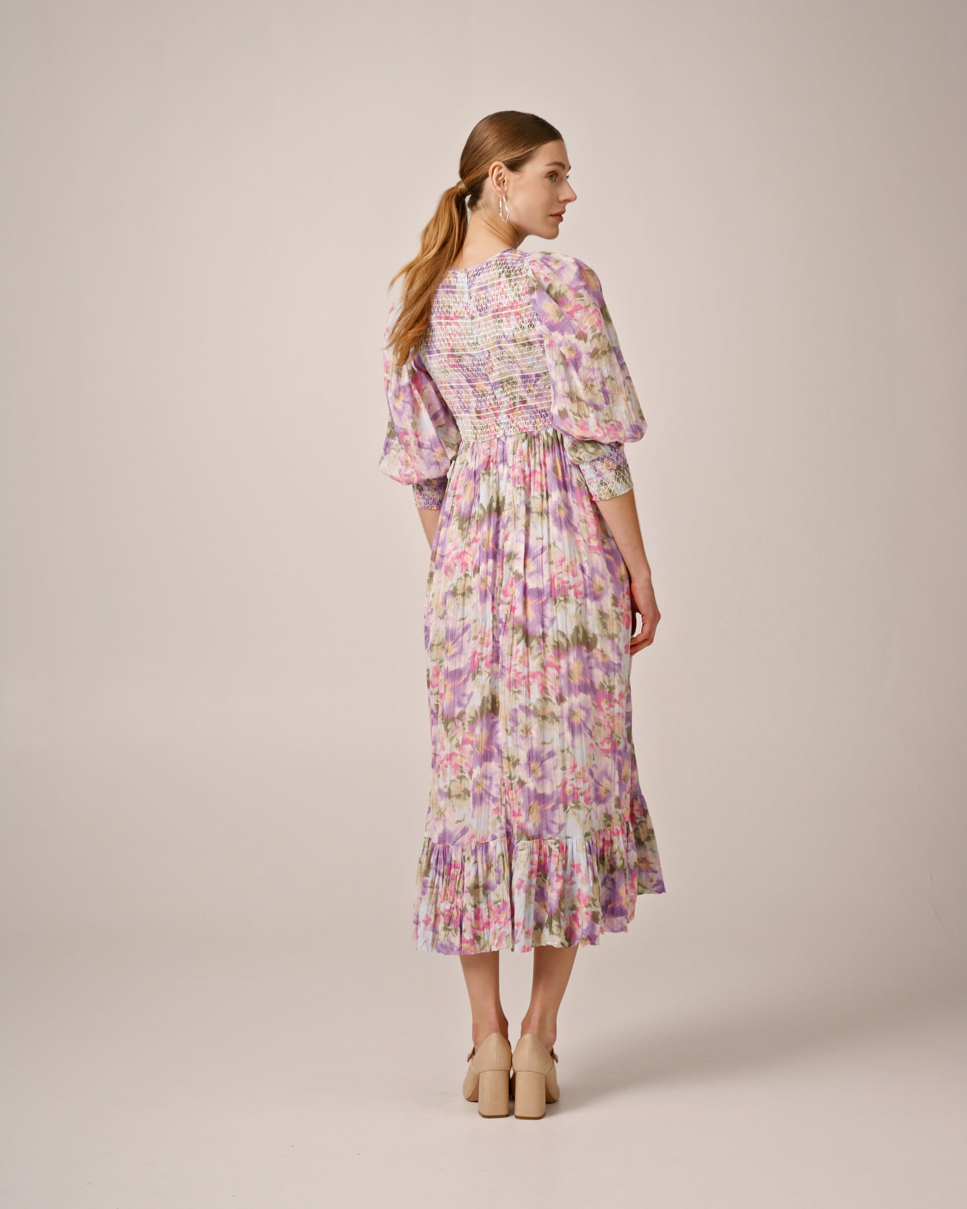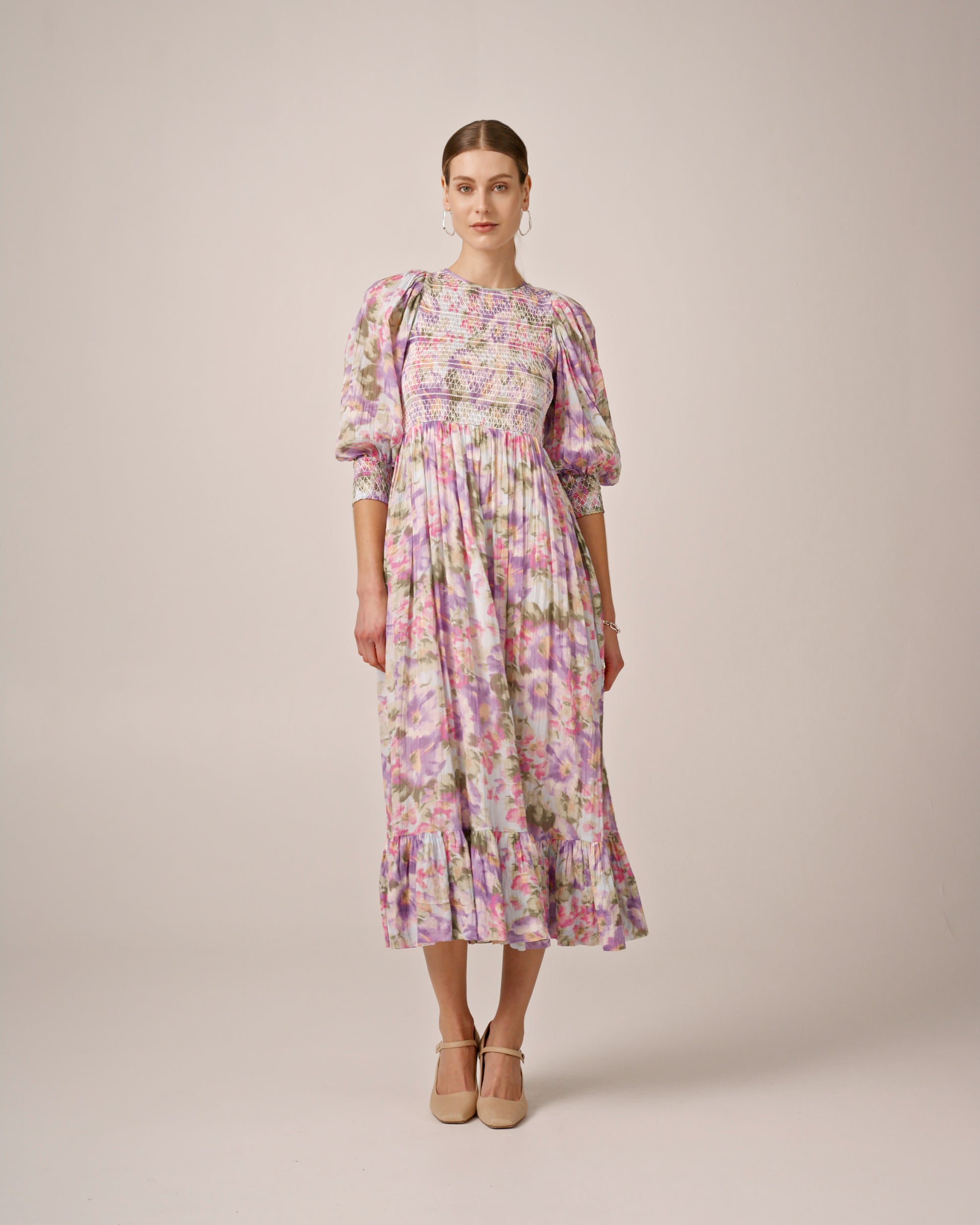 The Bohemian Smocking Dress is cut in our very soft and airy GOTS certified cotton. The dress has a midi length, fitted top made of elastic smocking, relaxed skirt, short, puffed sleeves with elastic cuffs, round collar and a ruffle detail at the hem.