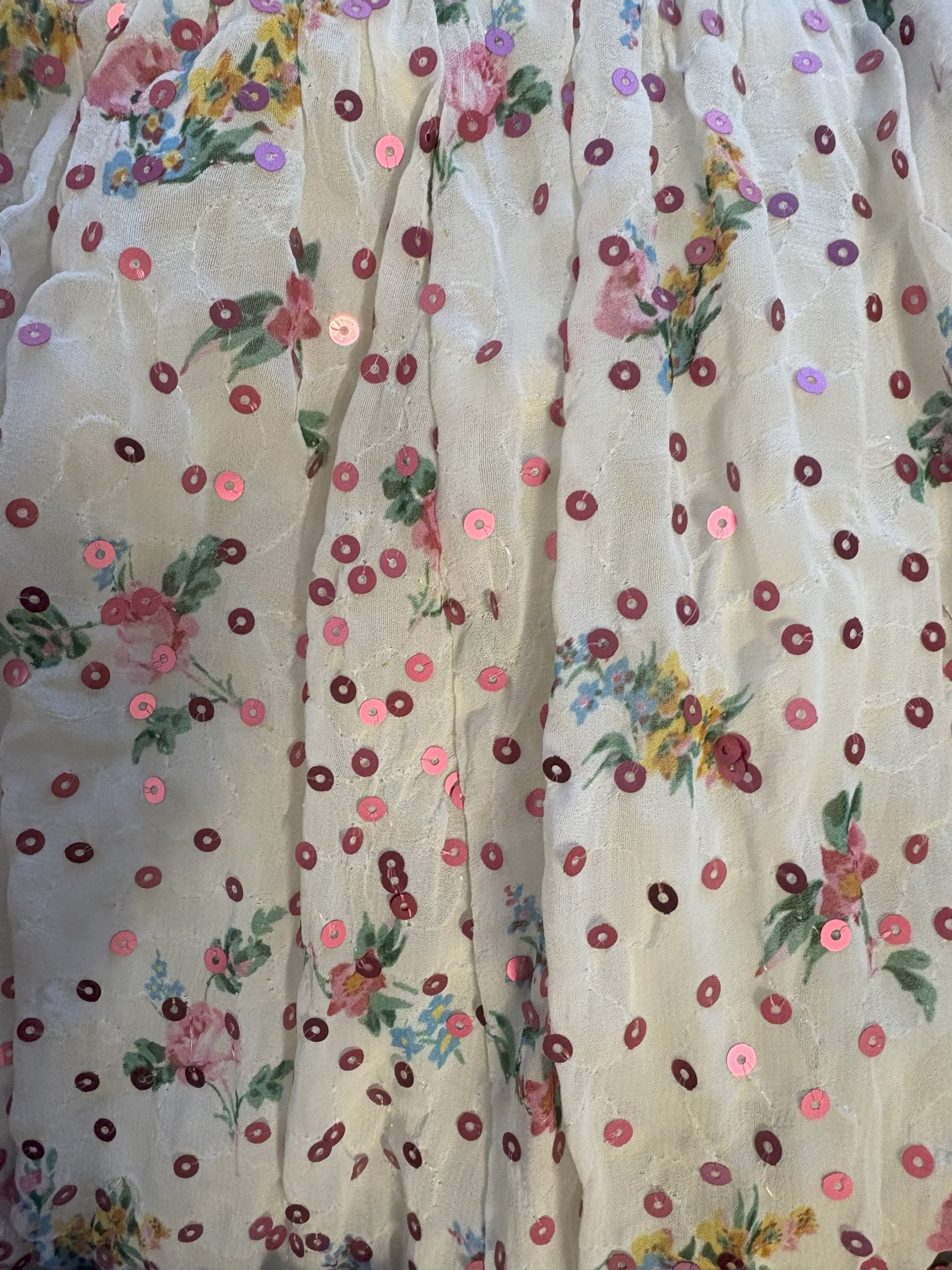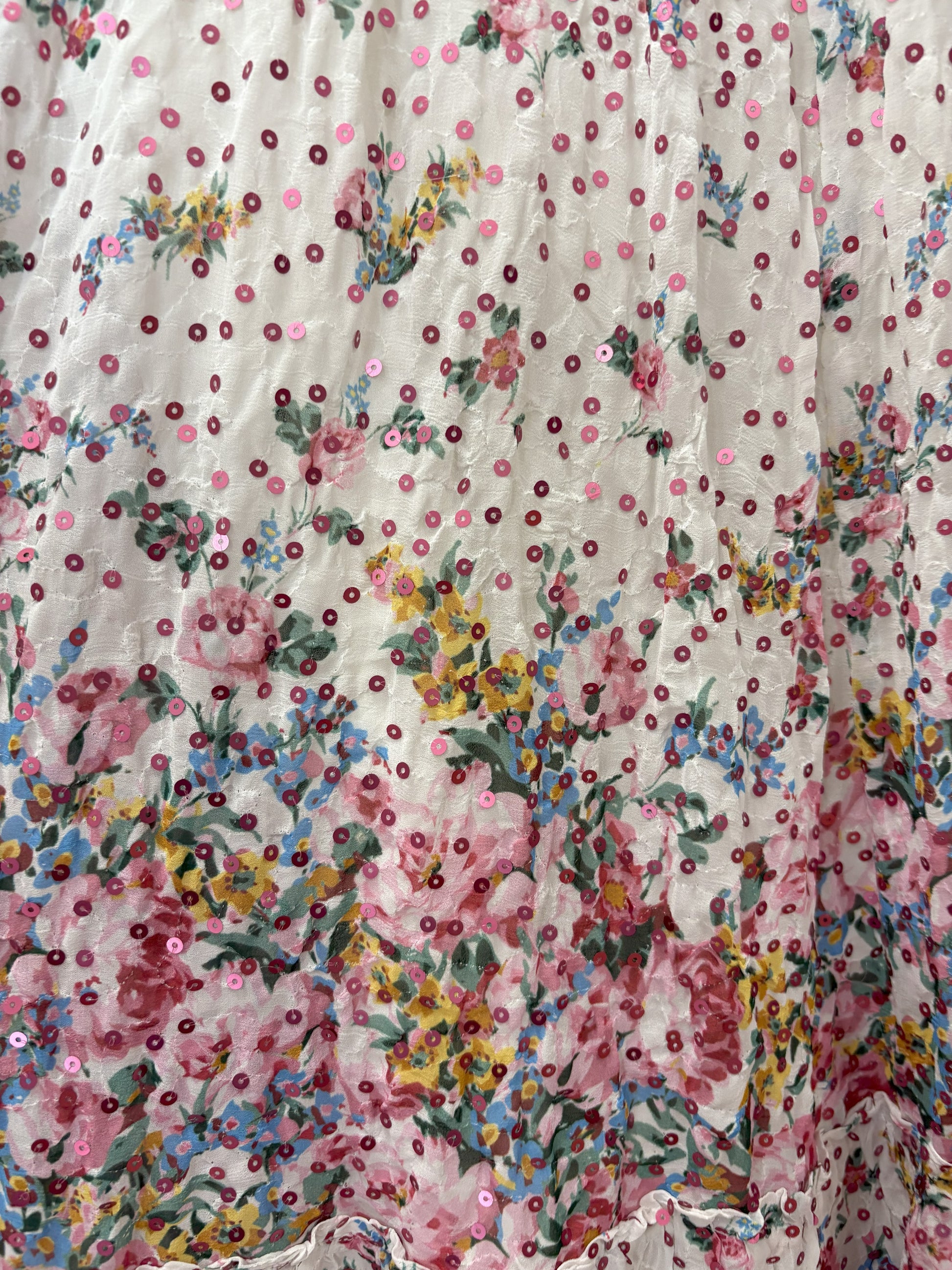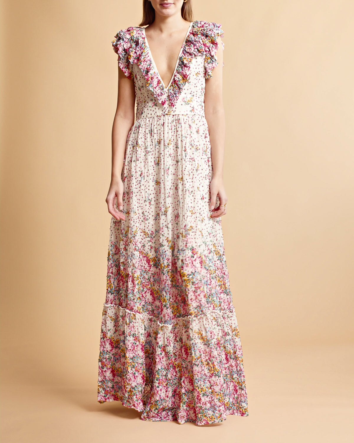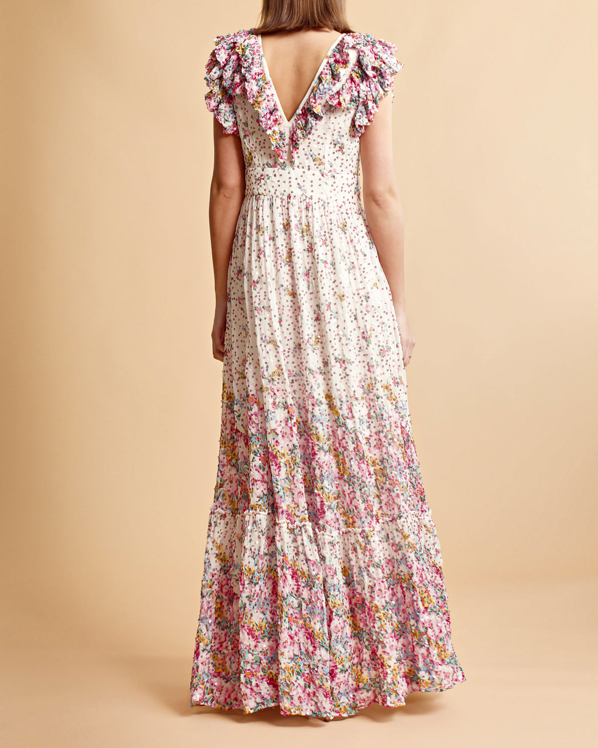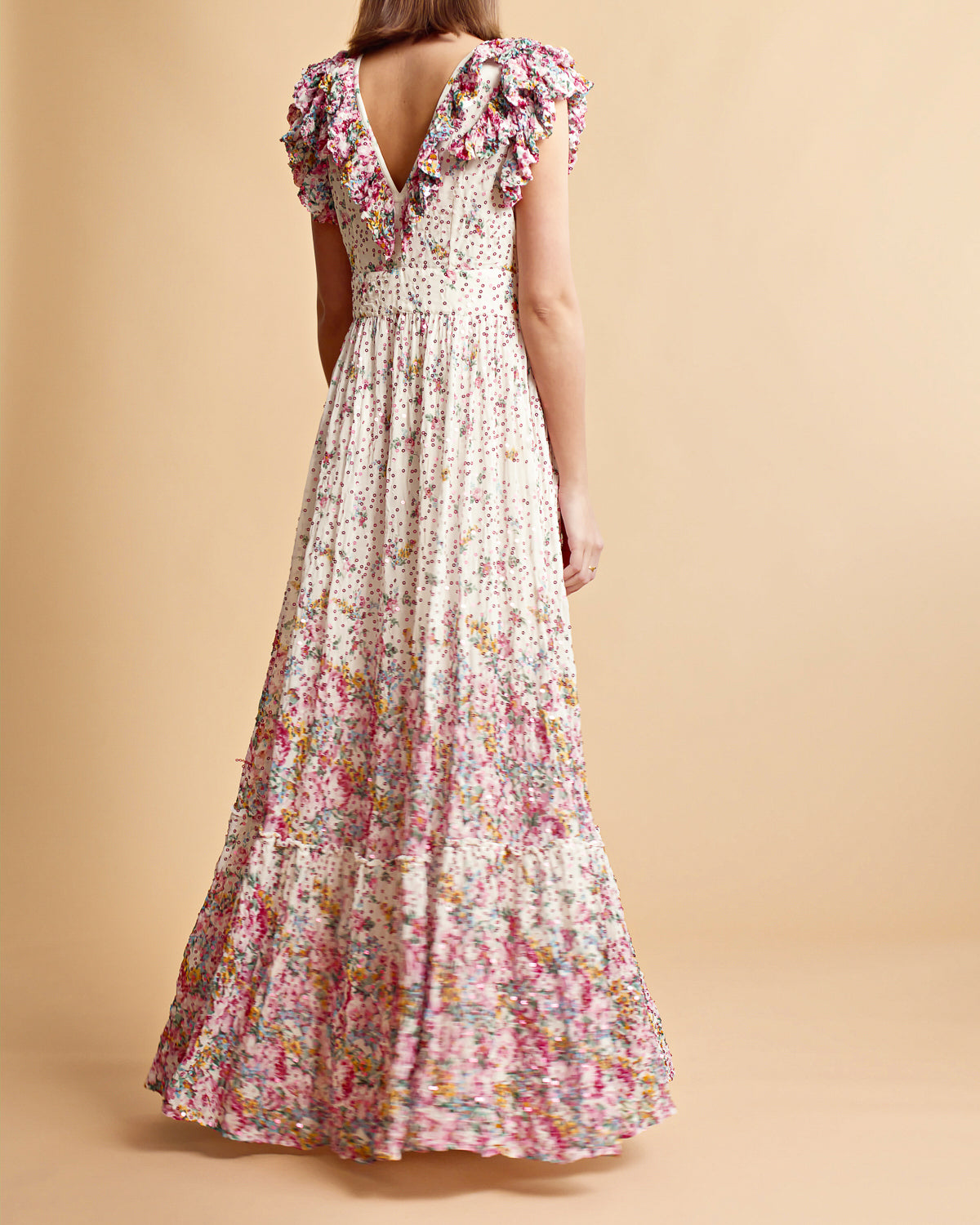This beautiful fully lined V-Neck gown designed in Norway is made from 100% FSC Certified Viscose with sequin beading. The fabric is a delicate georgette with individual beads that give it a lovely shine. It has a maxi length, a voluminous skirt and slightly fitted silhouette with a zipper on the side. The sleeves are short with ruffles down the neckline. The gown has a V-Neck at the back and front. The front has 3 hooks for extra modesty.