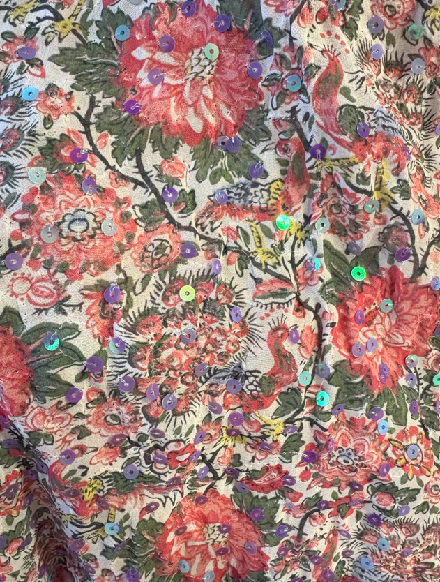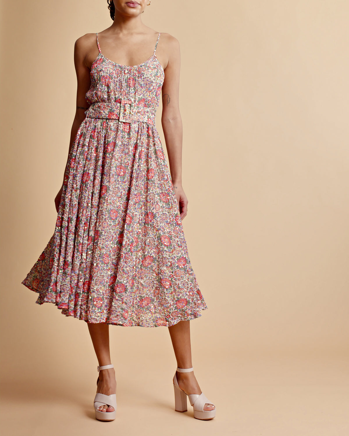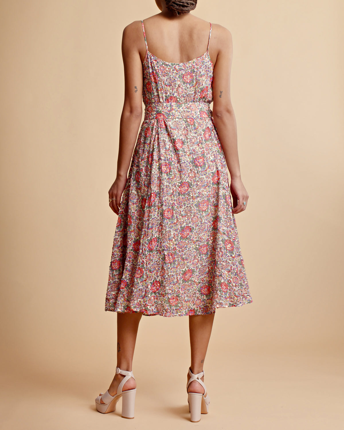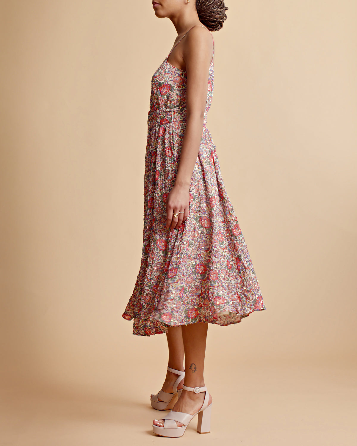This beautiful dress designed in Norway is made from 100% FSC Certified Viscose. It has delicate sequin beading over the fabric. Shoestring straps with a self belt.