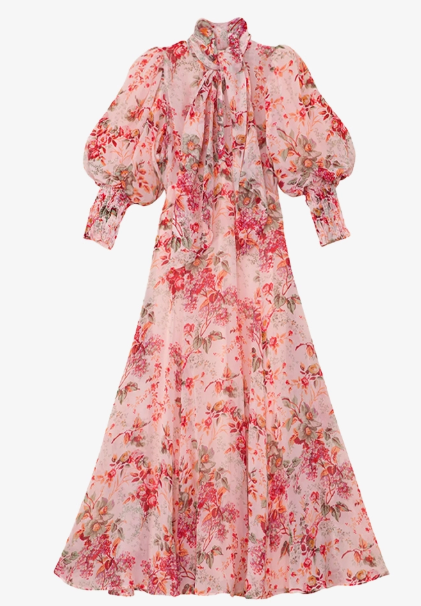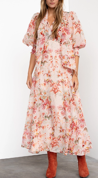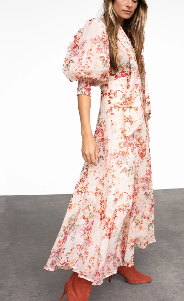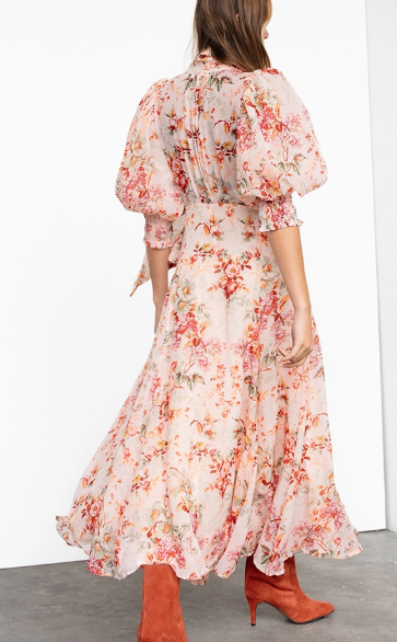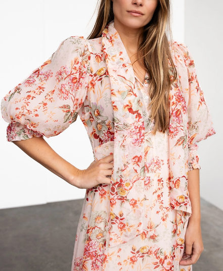 We're completely in love with this ByTimo Organza midi dress in a gorgeous pink blossom print. This stunning dress is perfect for a party. Crafted from FSC-certified viscose, it features a lined skirt, beautiful smocked elastic cuffs for puffed sleeves, a shawl collar, and a half-button closure with a semi-sheer top. Pair this dress with a gorgeous heel and style it with a beautiful bag.