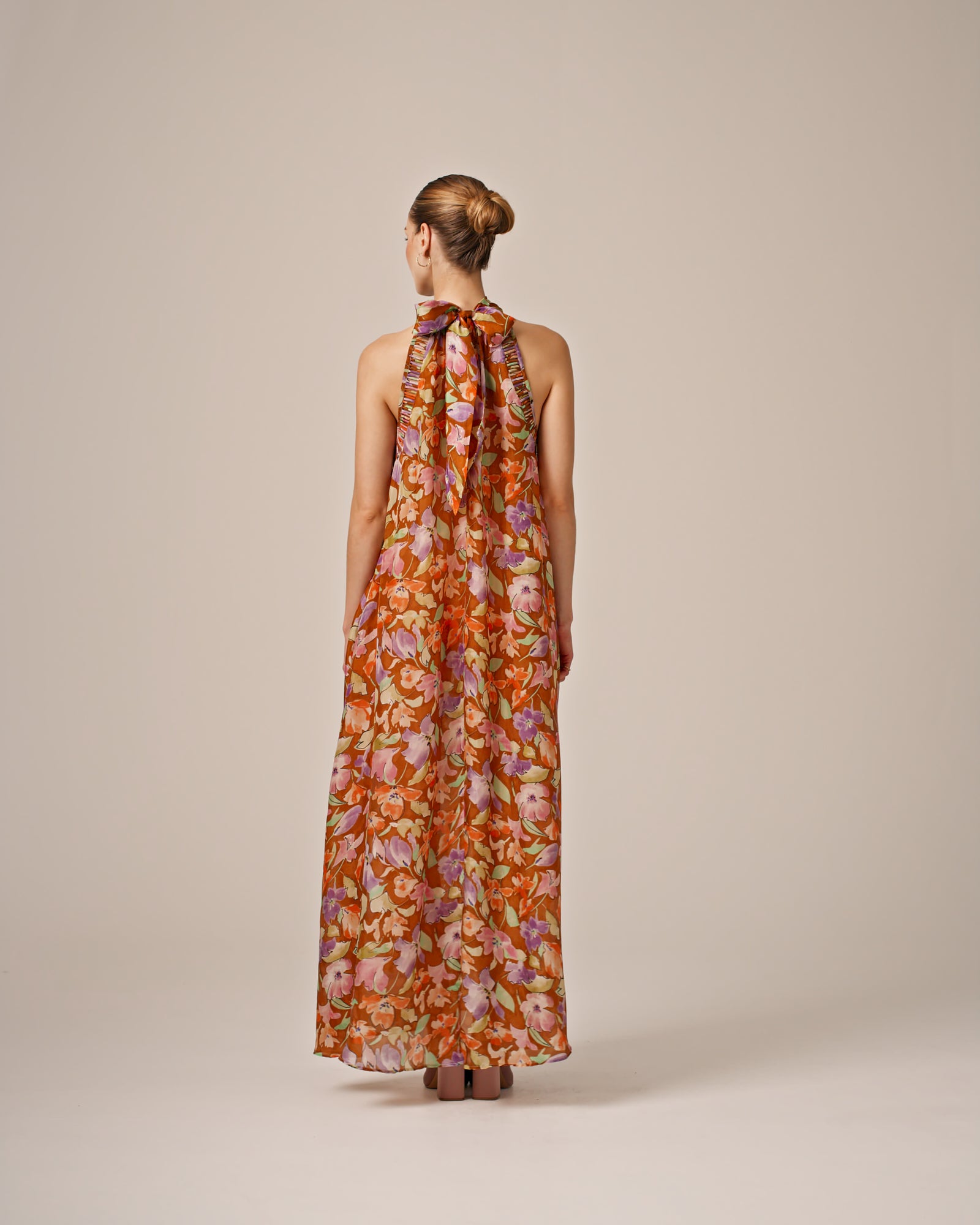 The Cupro Halterneck Dress is a beautiful and stylish maxi dress made from certified cupro. It features a high neckline, a loose fit, and a flowing silhouette. The dress has a tieband that can be adjusted to your liking. It is perfect for summery occasions.