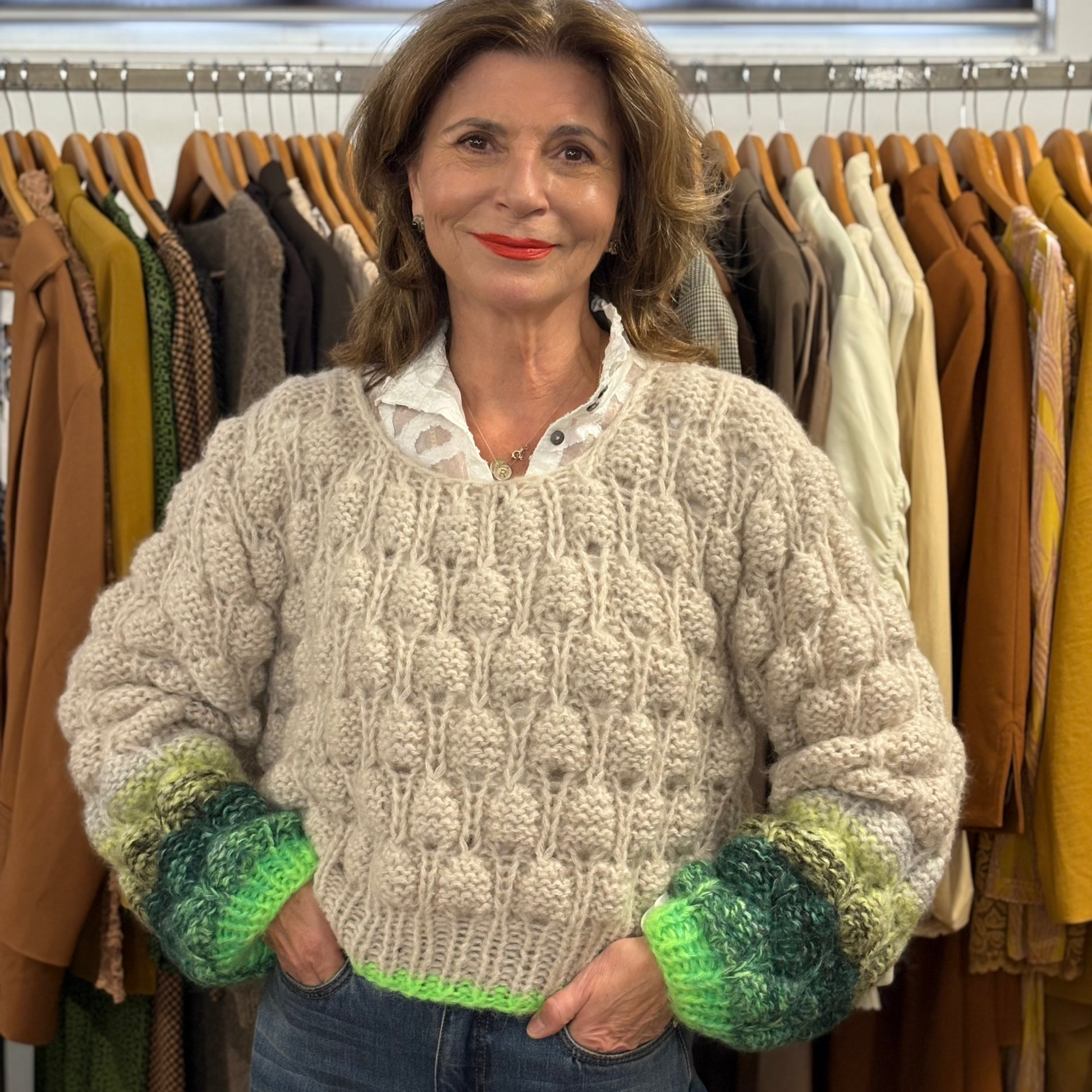 ANGEL is a cropped sweater with balloon sleeves and a round neck. It is knitted in a beautiful bubble structured pattern in our always popular mohair and acrylic mix which is super soft. We only use certified mohair yarns.
