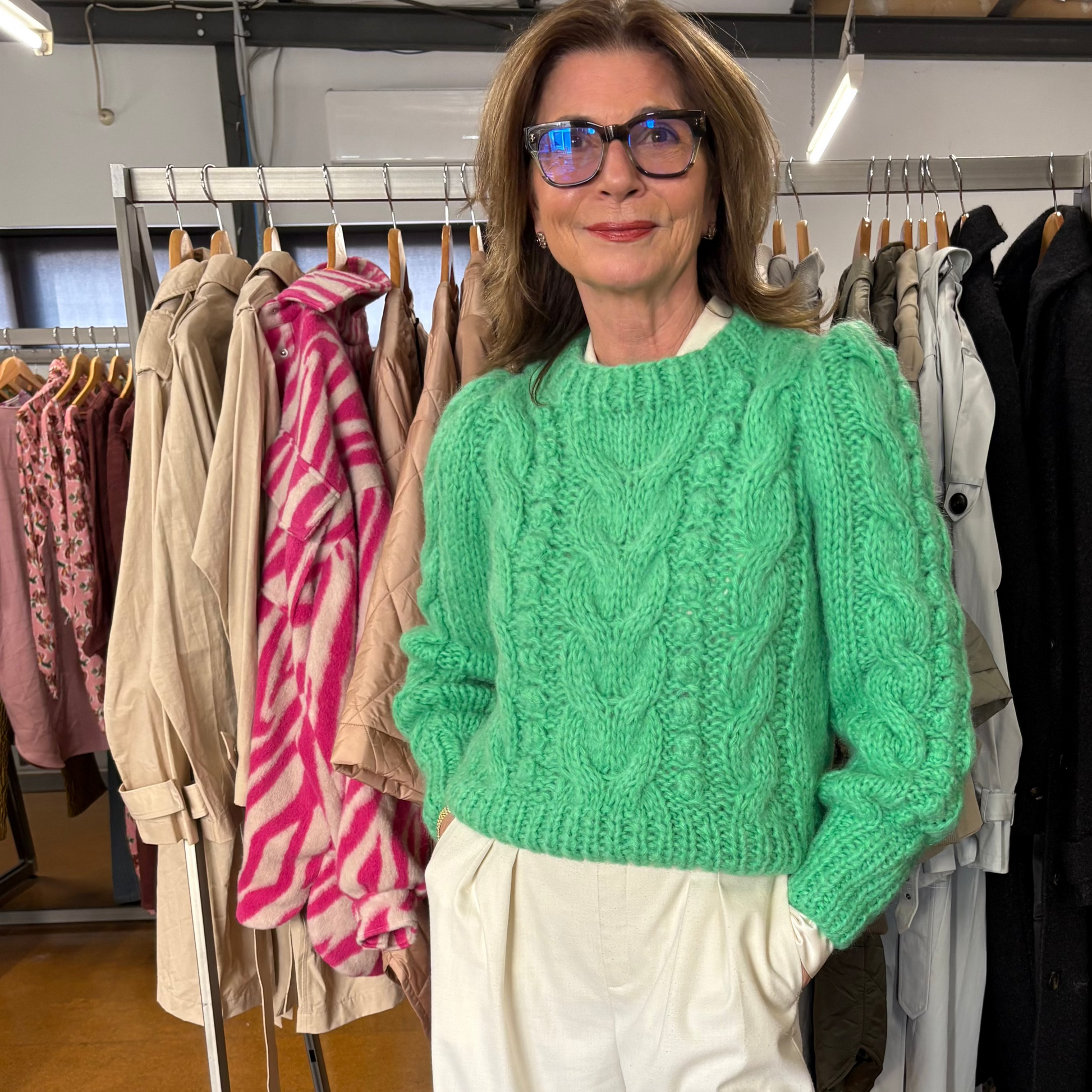FANTINE mohair blend cable knit has many feminine details in the hand knitted structures. A round neck and a slight puff at the shoulders makes FANTINE very easy to style all year round.