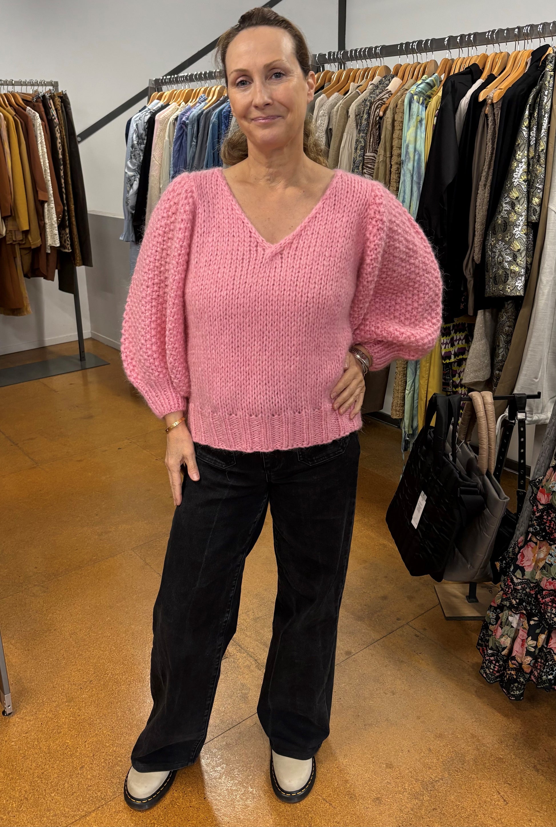 Faye hand knit in mohair with v-neck and slightly puffed sleeves which are three quarter length. The knit has detailed knit on the sleeves.