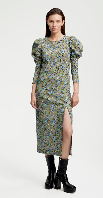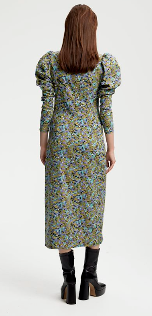 This feminine midi dress features a unique design and stylish details. With mutton sleeves, a crew neck, back zipper closure and an optional high slit at left leg with hidden zipper.