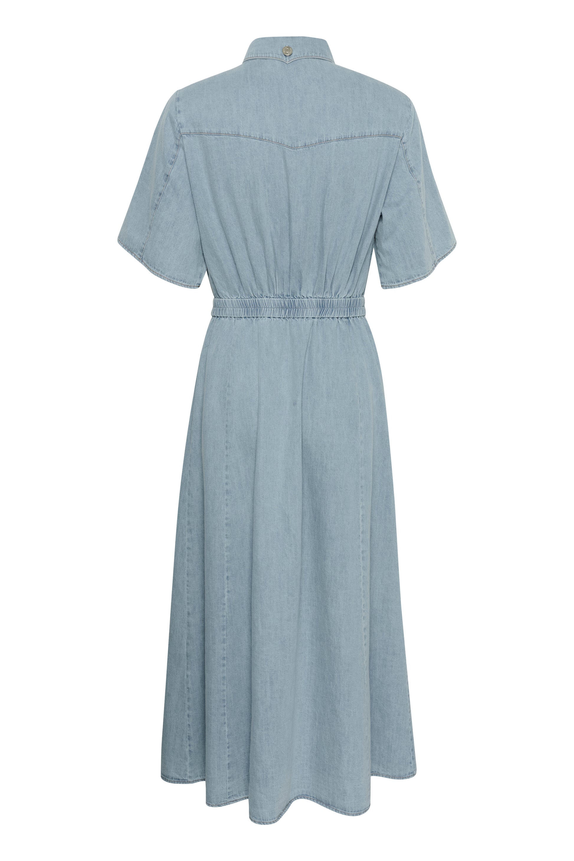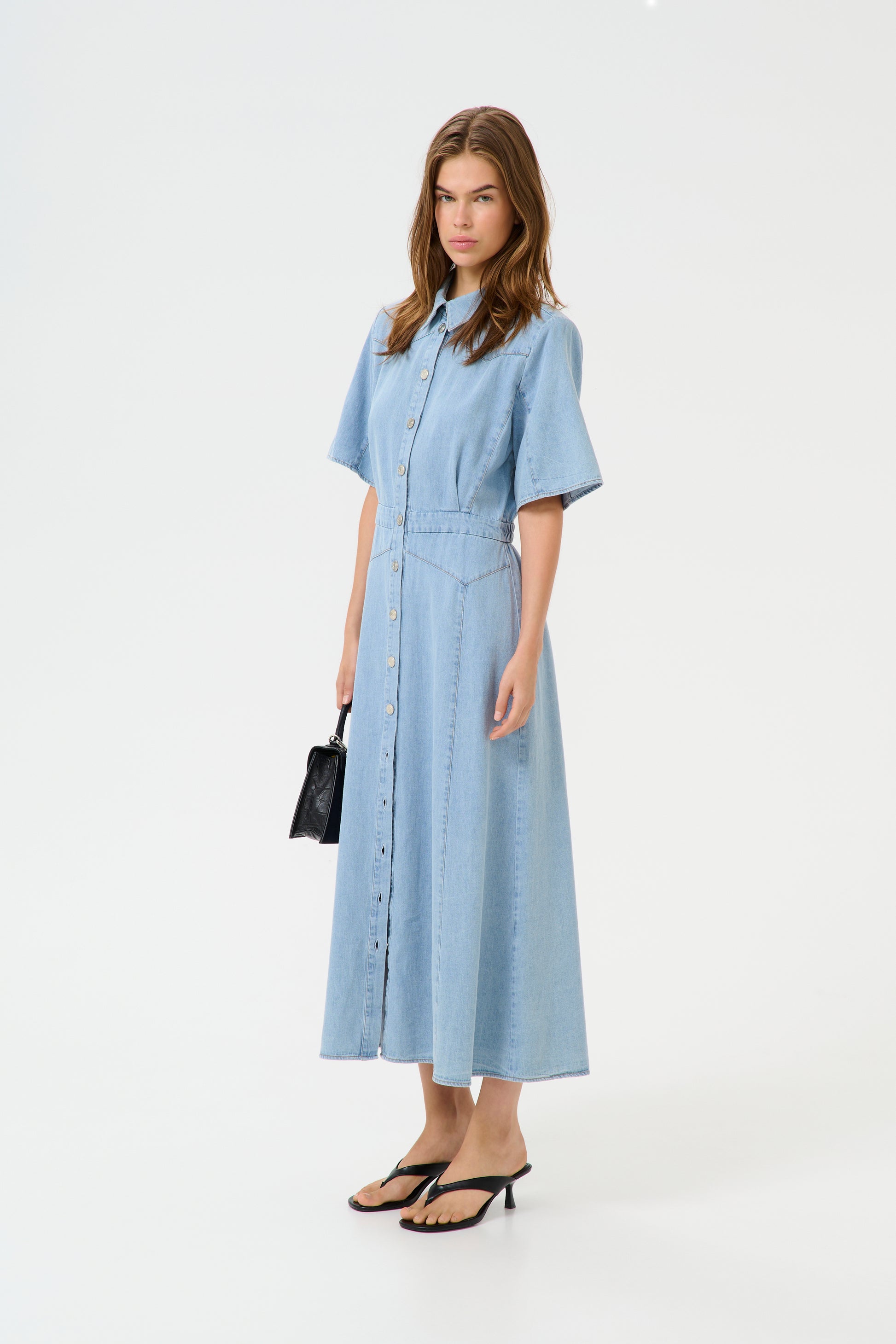 Midi-length dress in denim with a fitted waist and flared skirt. Features a classic shirt collar, front button closure, and short wide sleeves. A versatile choice for both everyday and occasion wear. The model is 179 cm tall and is wearing a size S/36.