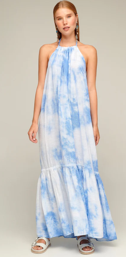 S22P1086298tiful halter neckline, marble maxi dress with band at the knee to create a pleated bottom.