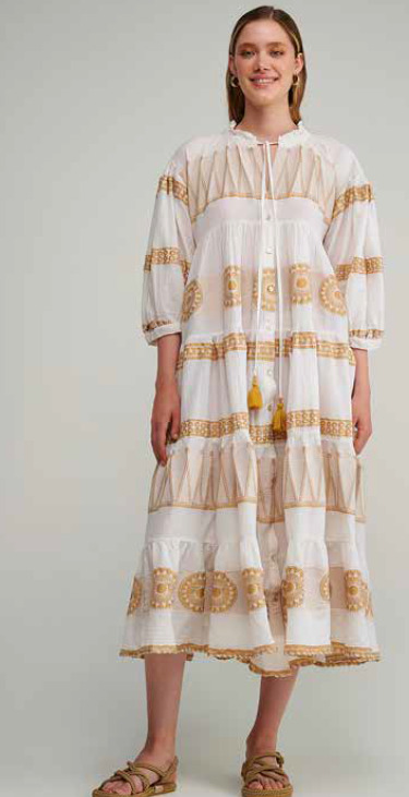 Lindos dress by Pearl & Caviar is a chic style dress in white color and beautiful gold embroidery inspired by ancient Greek designs. Woven jacquard cotton fabric made in Greece.