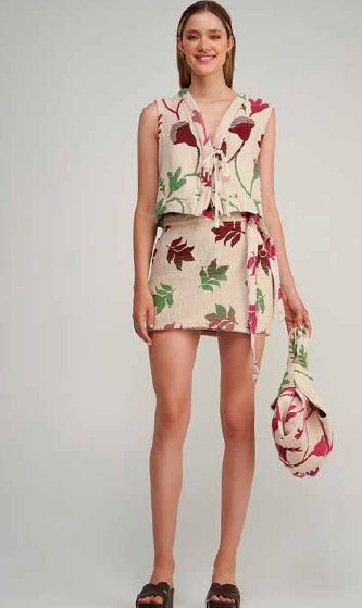 This beautiful vest features a v neckline with thick straps that ends just at the shoulders and opens up down the middle.