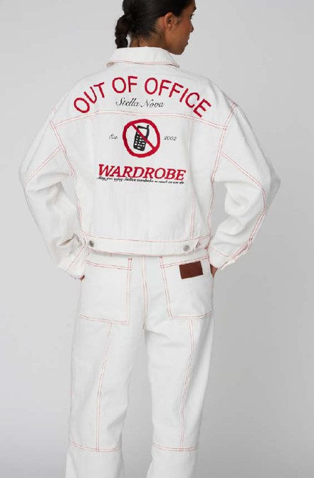 Cropped denim jacket featuring an embroidered OUT OF OFFICE statement on the back, bold stitching, a button closure, and chest pockets.