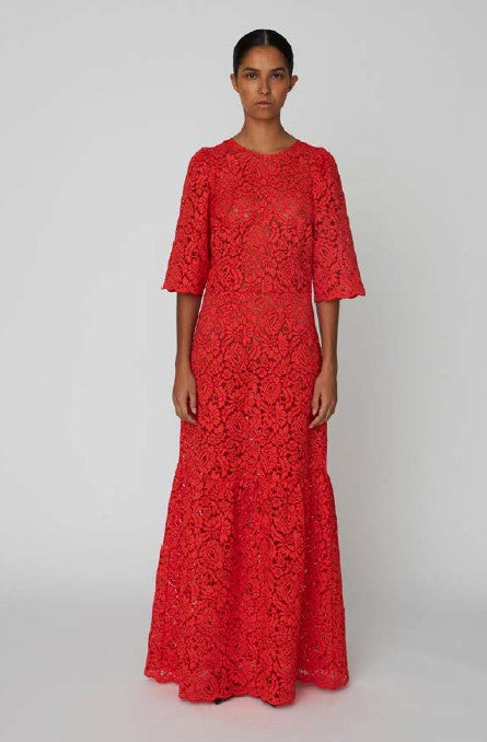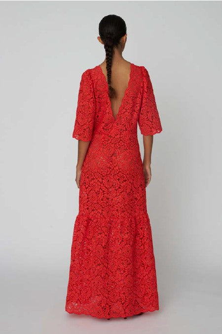 Crafted with intricate lace detailing, this dress offers a sophisticated and feminine touch. The design features a flattering V-neckline and elegant half-sleeves, making it suitable for various occasions. Its flowing silhouette ensures a comfortable and stylish fit.