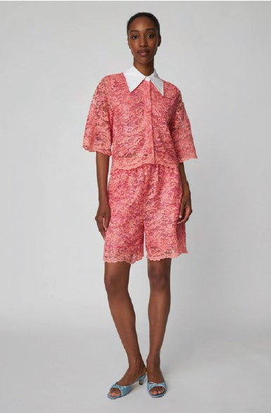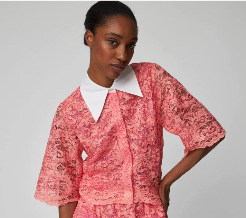 Cropped lace shirt with sequins. The shirt features half-length sleeves, a classic collar, and a button closure at the front.