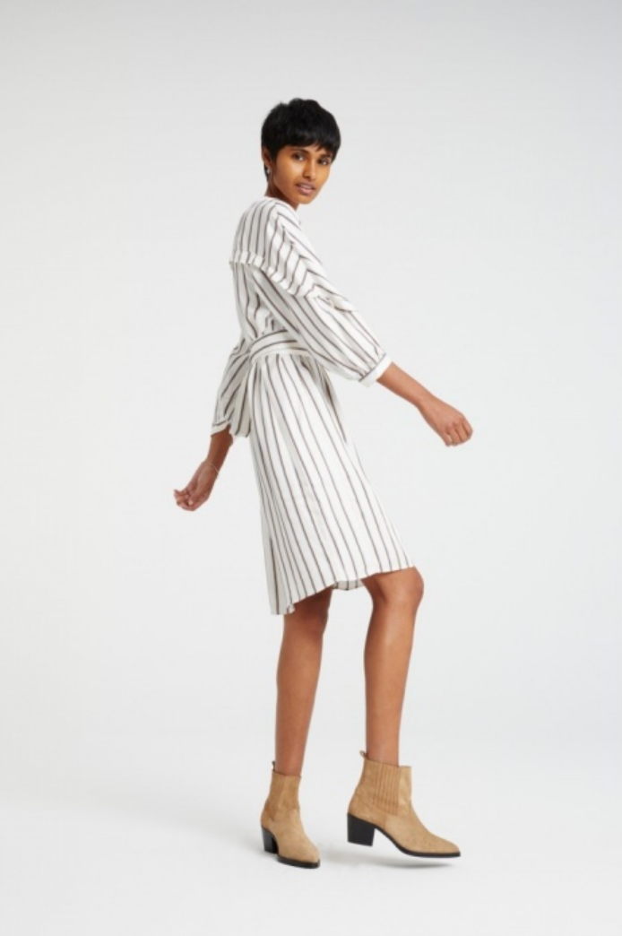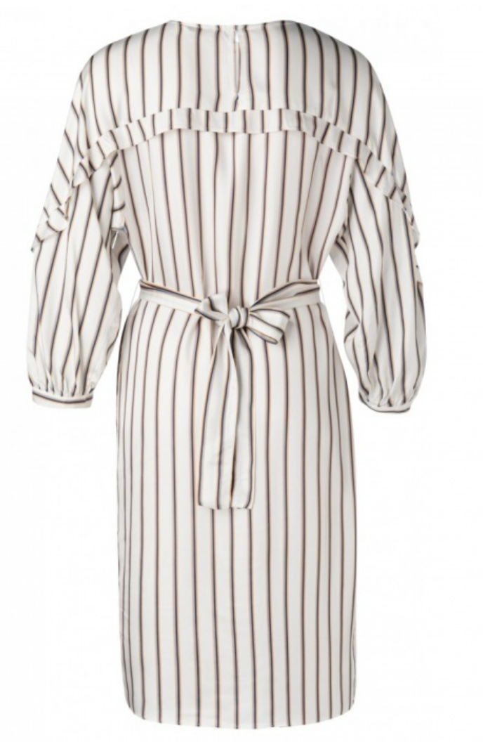 A feminine dress from Yaya designed with a vertical stripe print and subtle ruffles on the back and sleeves creating a unique look.